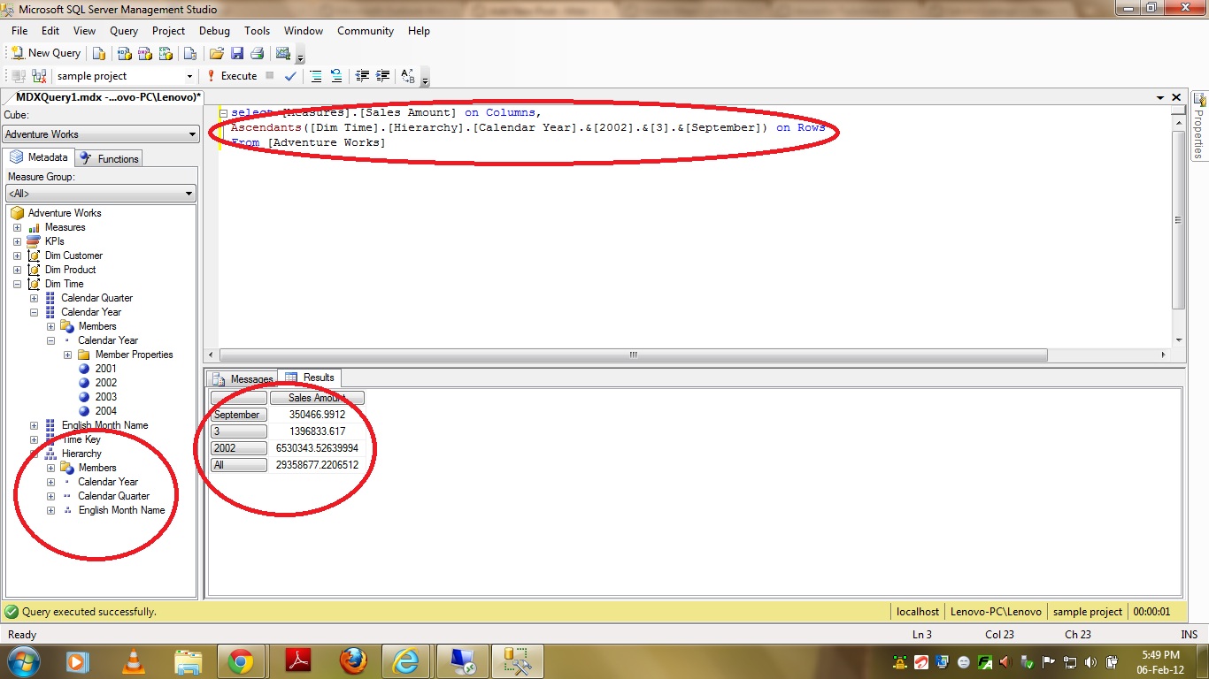 In the above query I am asking for Ascendants of “[Dim Time].[Hierarchy].[Calendar Year].&[2002].&[3].&[September]” member which belongs to MONTH level of Hierarchy and the result set looks like in the below given screenshot –