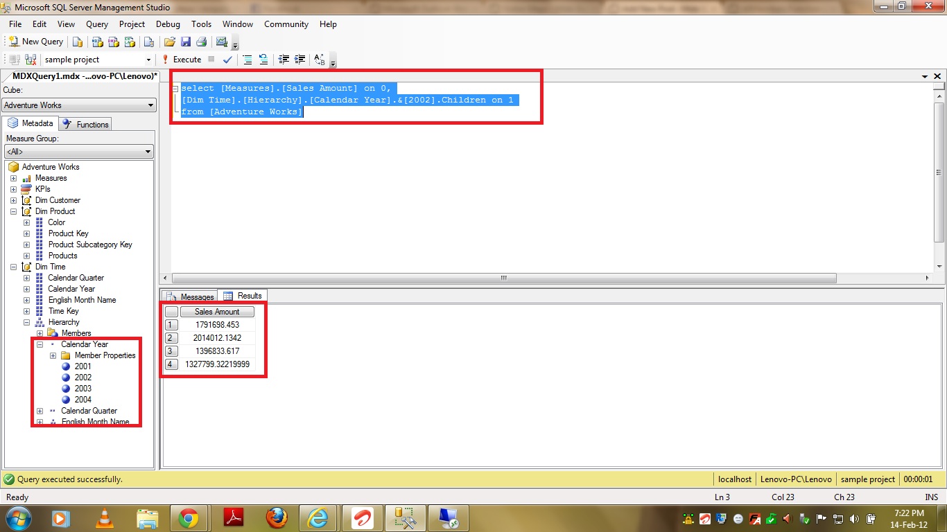 Now, in the below query I passed 2002 from “Calendar year” level as member_expression to the children function and the query returned the children of 2002 member i.e Quarters 1,2,3,and 4 as shown in below Screenshot.