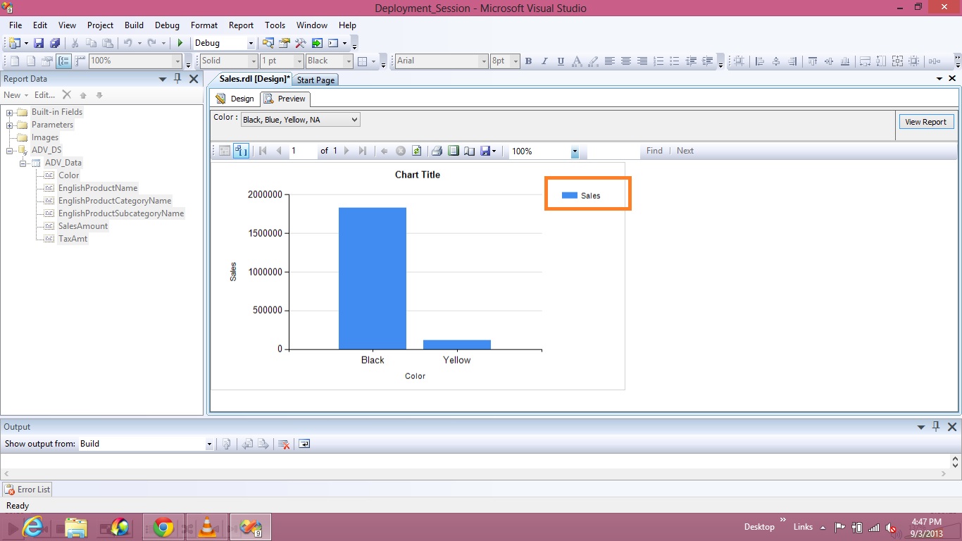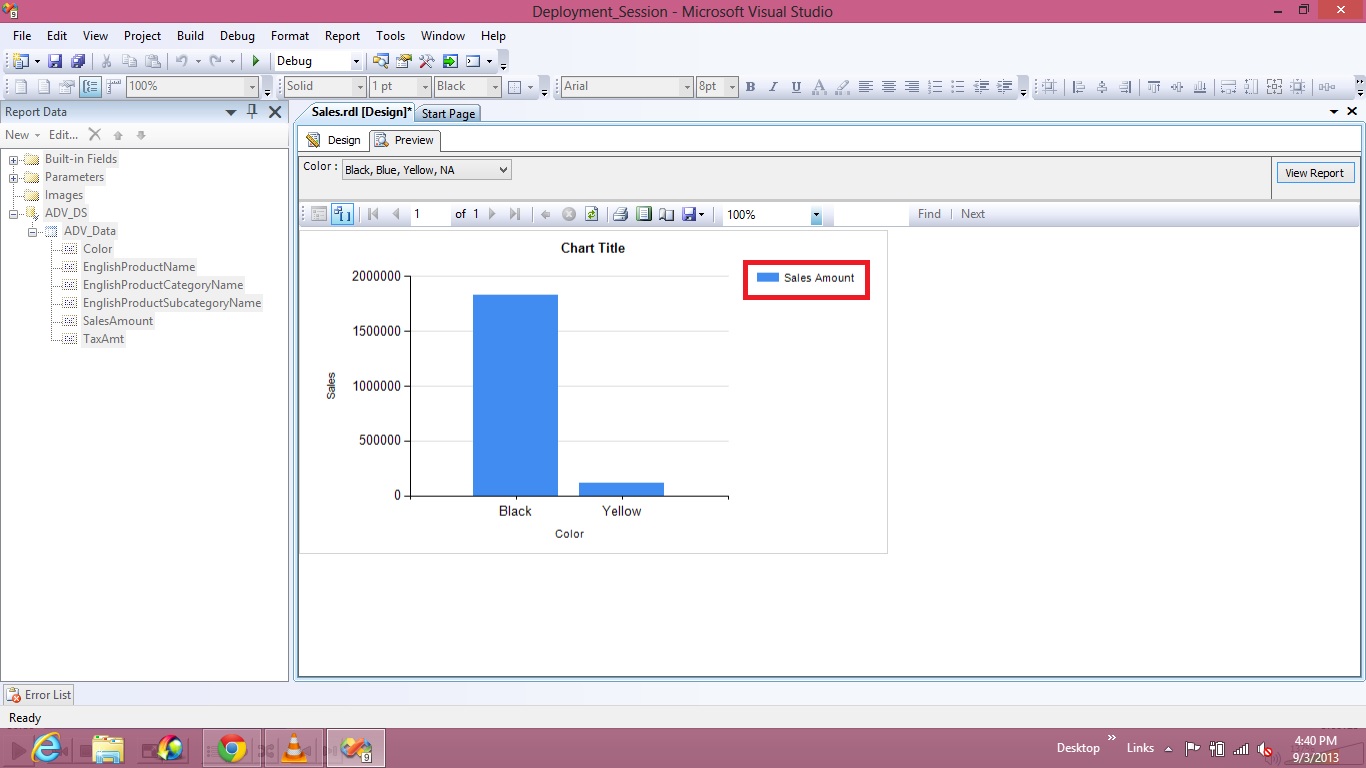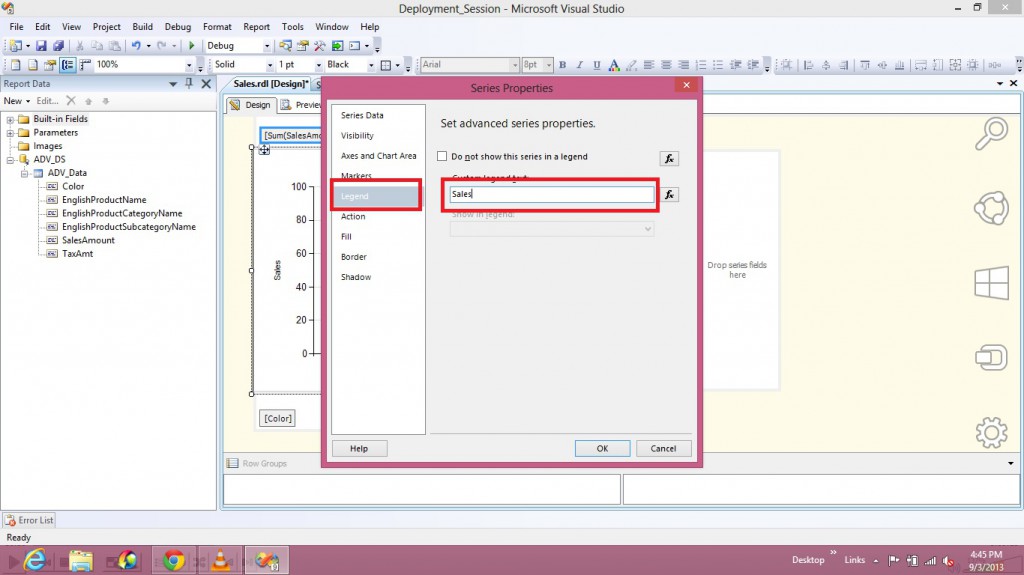 In the above report, I selected Sales Amount field under Data Fields and hence Legend is showing as SALES AMOUNT and if you wish to change the default Legend Name to a Custom one then follow the steps given below.