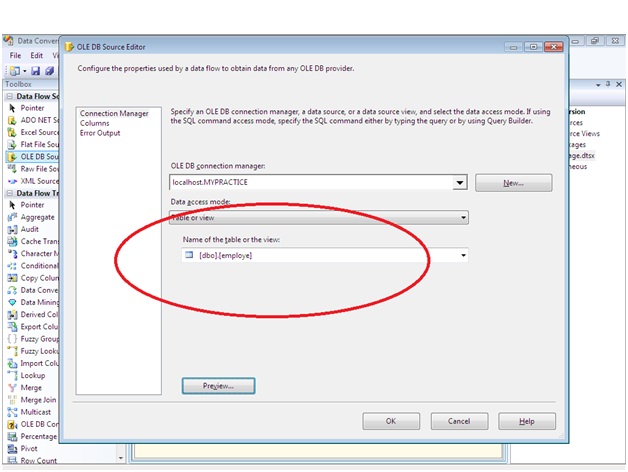 • Select OLE DB data source from data flow sources and drag and drop it in the data flow.