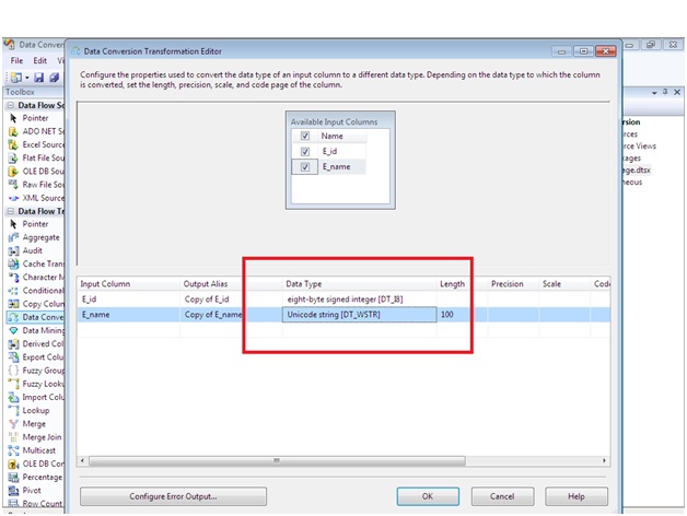 • Double Click Data Conversion to change the data type of any column you wish to and you can do that by changing DATA TYPE Column as shown below.