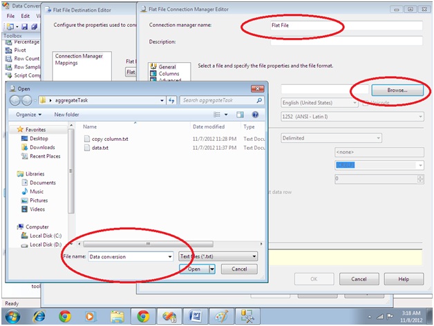 • Double click on Flat file destination and set the flat file connection properties as shown below.