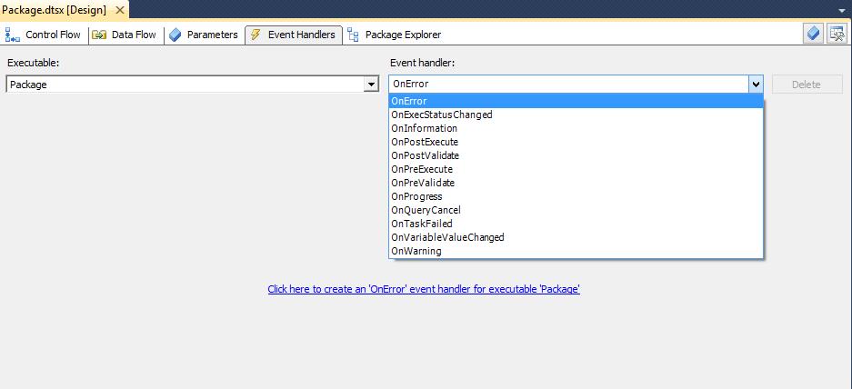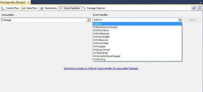 Let’s discuss a very little bit about different events available in Event Handlers in SSIS Packages. To turn SSIS package into a trustworthy system which are useful for audit, response appropriately to Error conditions, progress the report and allows instrumentation and keep an eye on respective SSIS packages we need the simplest means of SSIS Event Handlers. SSIS event handlers are very easy to implement and accommodate a great flexibility. As the name suggests, based on certain event, we would like to take some action (handle the event) the way we want. We may want to shoot an email in case of an error or failure in the package. Or we might want to truncate a table once the ETL is completed. you can see all the events in Event Handlers tab in Package as you c an see in below pic.