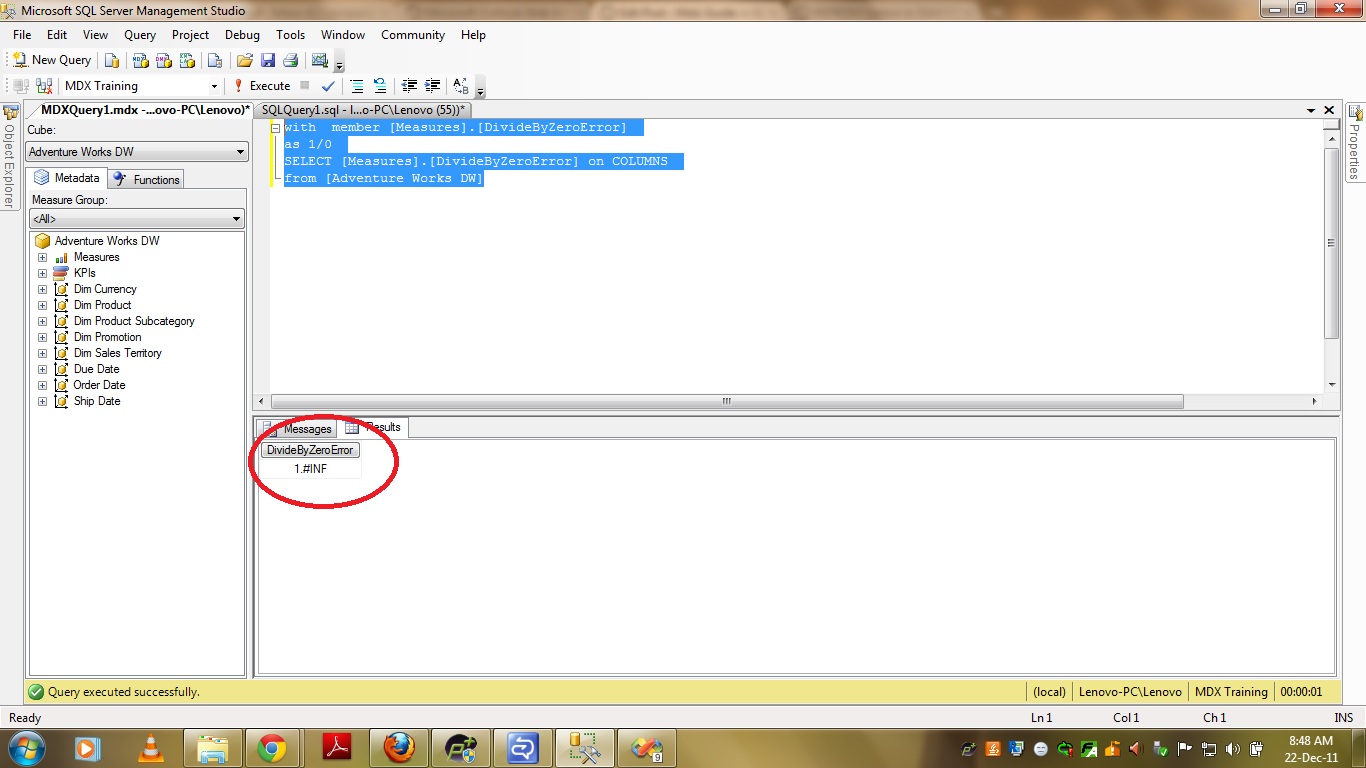 Handling Divided by Zero errors are very important in MDX. In other words we can call it as Divided by NULL errors in MDX. The error that show when you try to divide by Zero/Null is “1.#INF”. Lets see a small example.