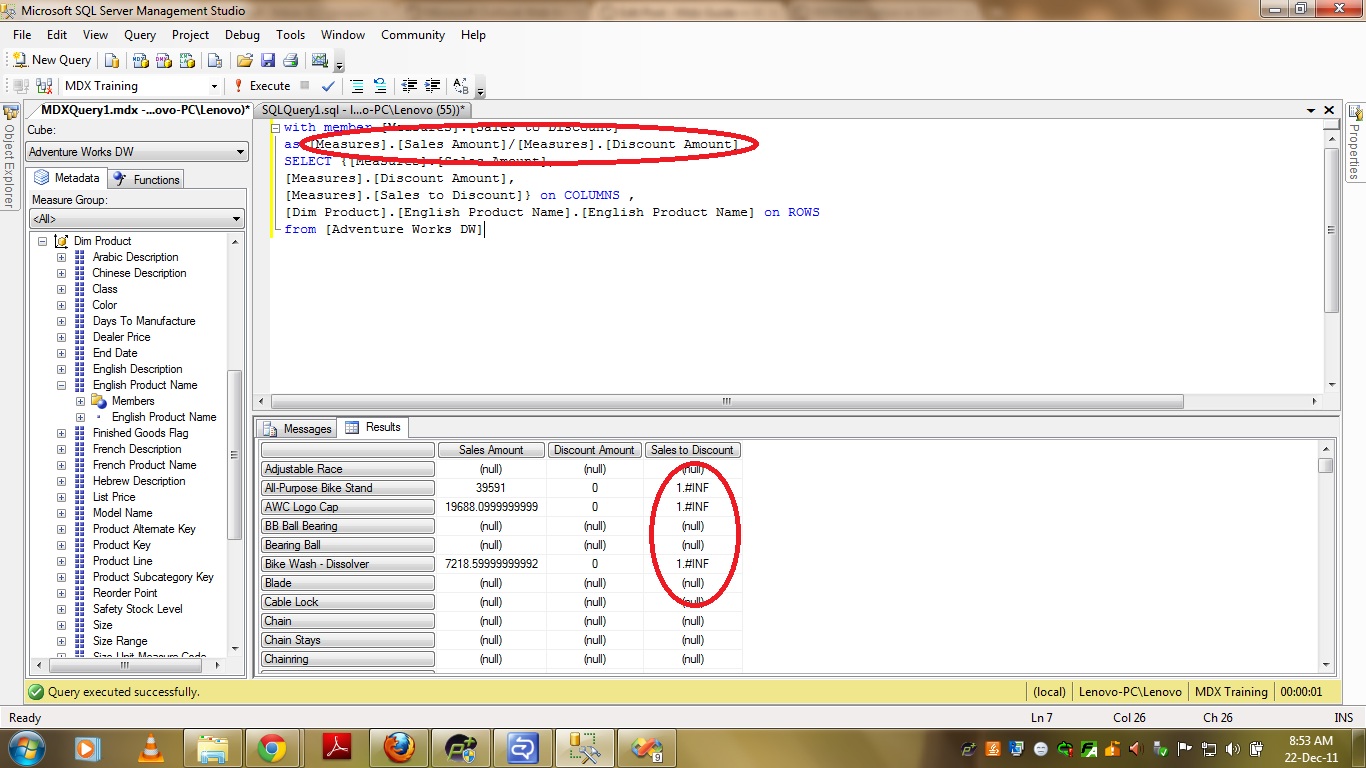 IF you run the above query you can see many values coming as “1.#INF” as Discount Amount is either NULL or 0 for many products and PFB Screenshot of the same.