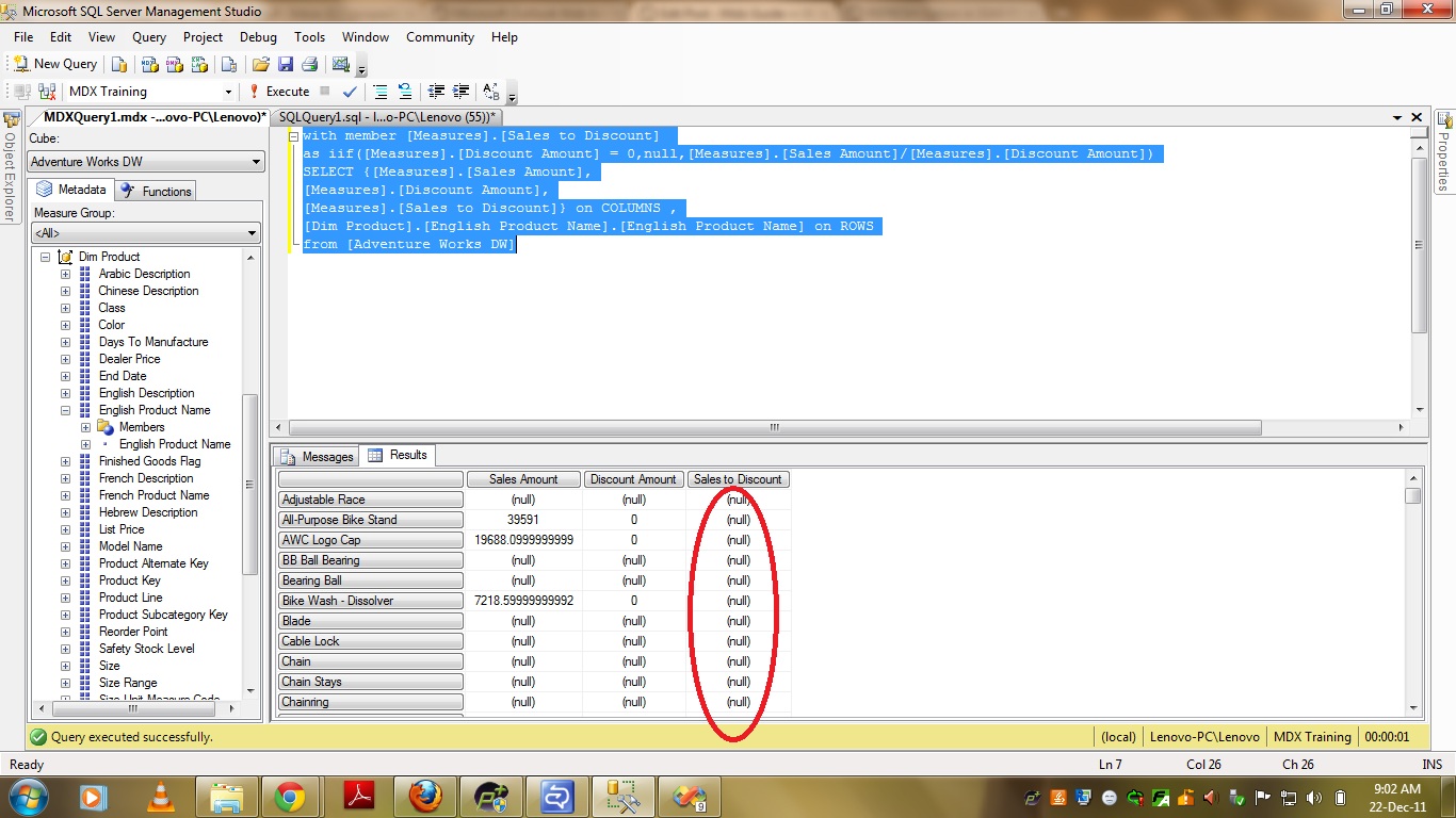 In the above query I am specifying that if Discount Amount is 0 then place NULL for the product in the calculated measure output else calculate the value. The output will look like this –
