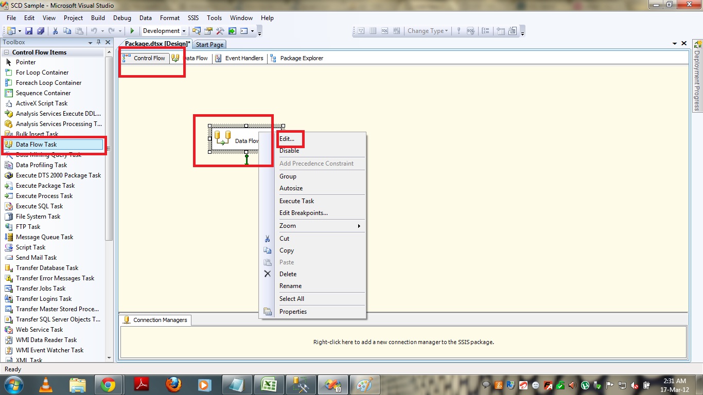 - Either double click or Right click on Data Flow Task and select EDIT as shown below.
