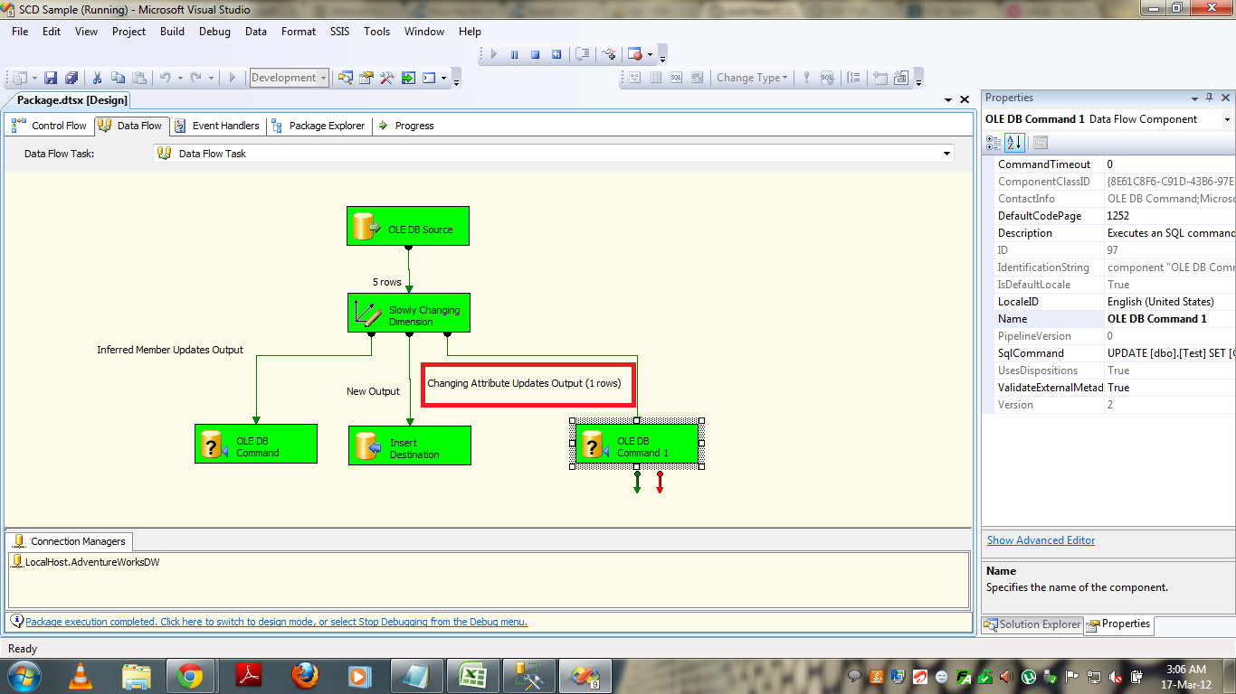 - Once I run the package you can see the package showing “1 rows” under “Changing Attributes Updates Output” section as shown below.