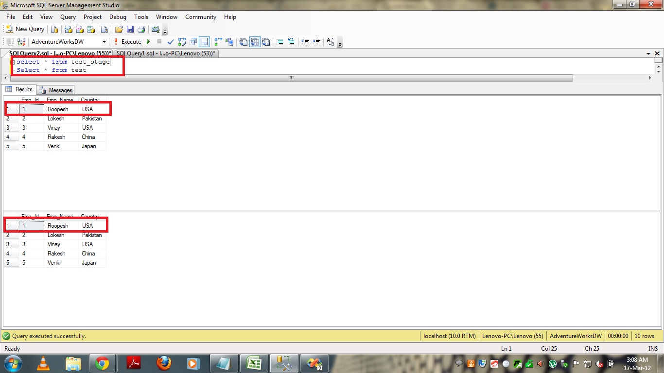 - Now I updated the existing records in staging table using the following queries and once I run the package again we can see data getting updated into our main table.