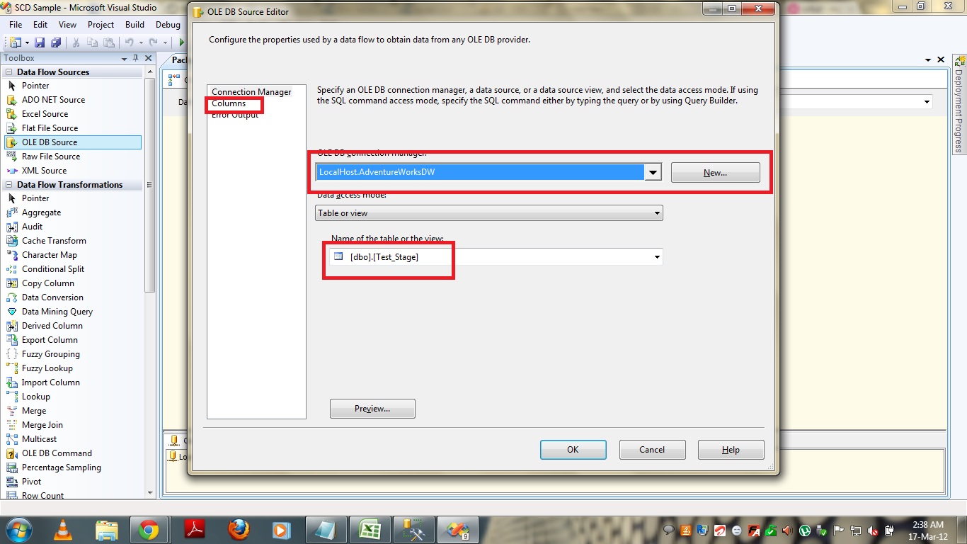- Now select EDIT by Right clicking on OLE DB Source and provide the Source details. remember that you have to provide Staging table connection details here.