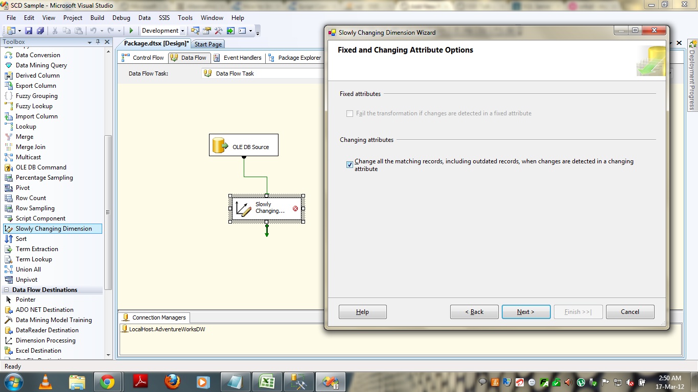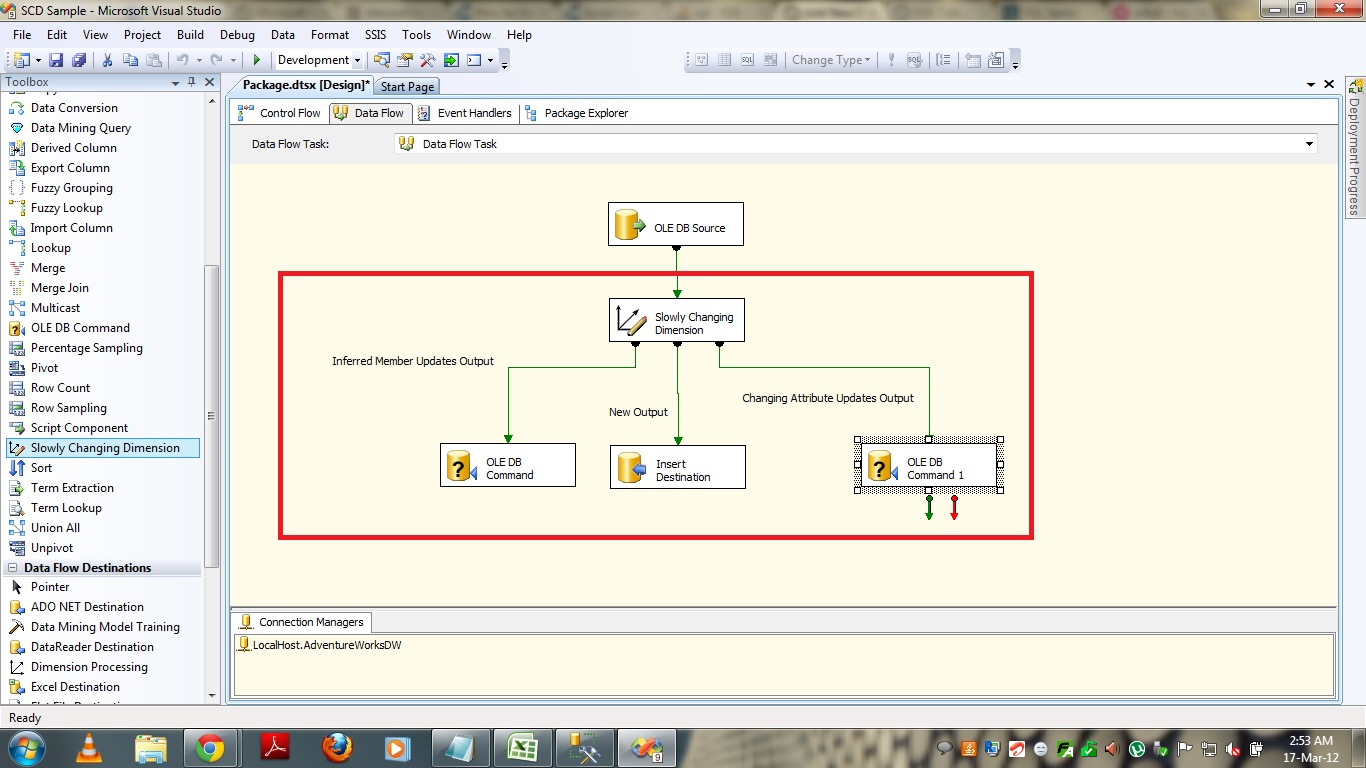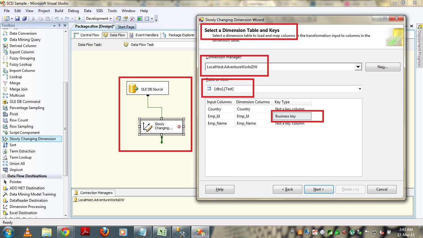 - Now drag and drop Slowly Changing Dimension Transformation in to the Data Flow Pane and provide the connection between OLE DB Source and SCD Transformation.