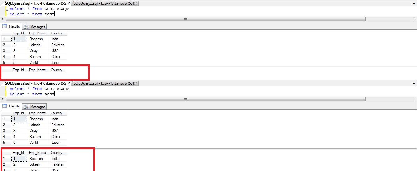 Now I inserted some records into my staging table i.e Test_Stage and PFB the scripts used –