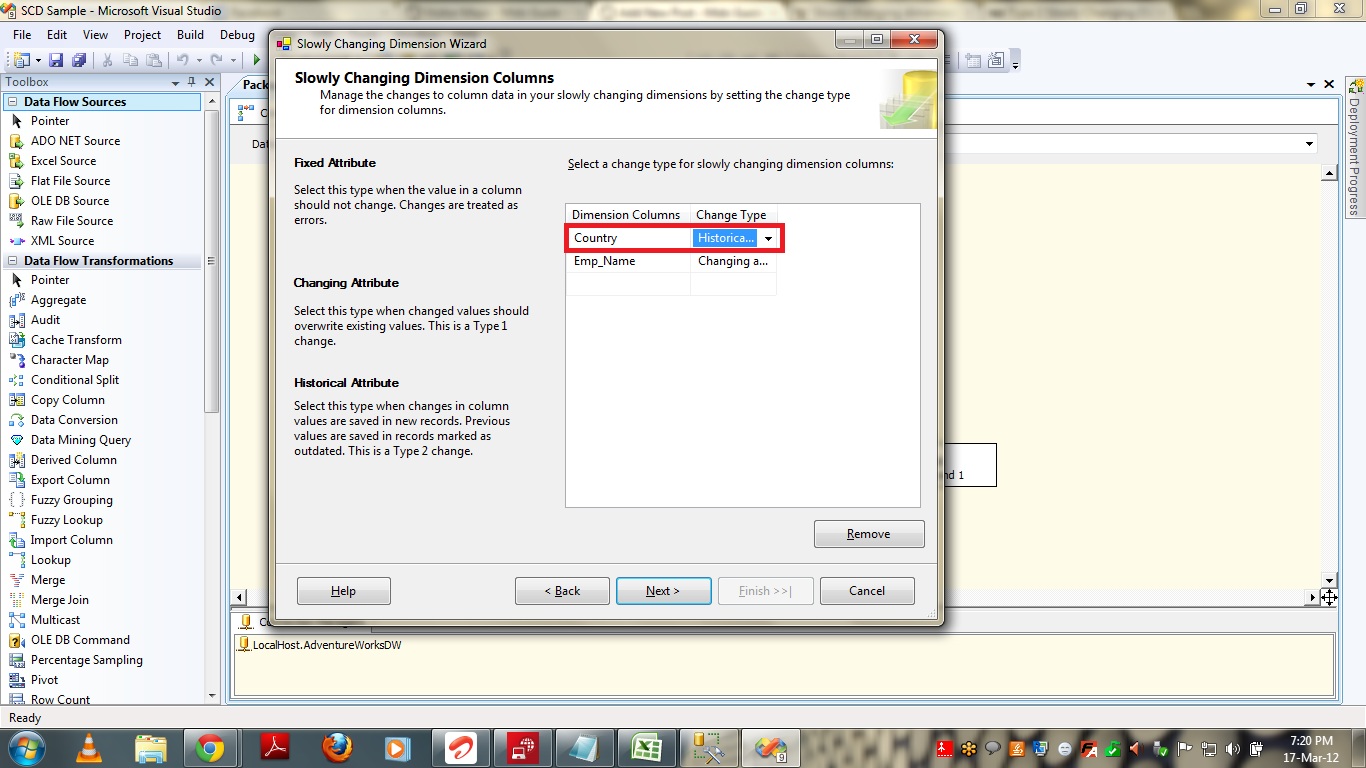 - After selecting Next, Under “Slowly Changing Dimension Columns” select the columns that MAY change and select Change Type as “Changing Attribute” for those which we DOESN’T required to maintain HISTORY and select “Historical Attribute” for those whose HISTORY needs to be tracked. This is very important part of SCD and in other words this is the ONLY change we have when compared to SCD Type 1 and SCD Type 2 implementation in SSIS. When we select “Changing Attribute” for any attribute then it WON’T CREATE a new record when there is a change in this value and if you select “Historical Attribute” then if there is any change in this attribute value then a NEW RECORD will be created to track history.