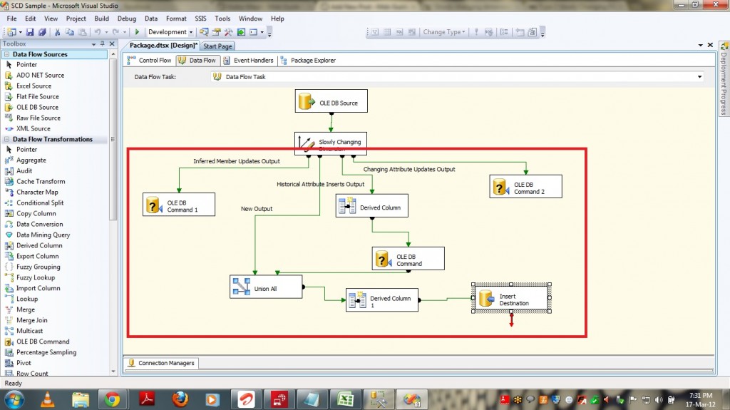 - Now drag and drop Slowly Changing Dimension Transformation in to the Data Flow Pane and provide the connection between OLE DB Source and SCD Transformation.
