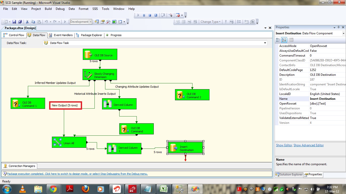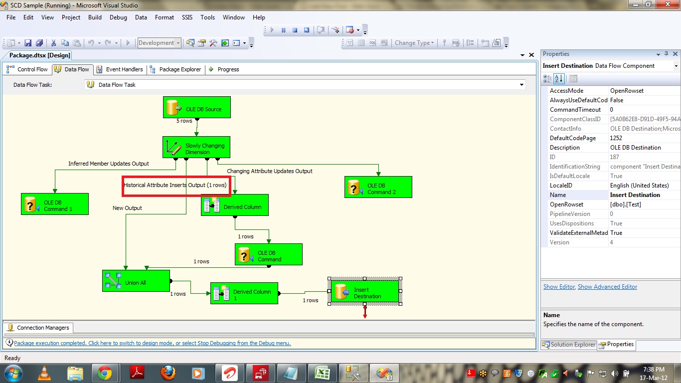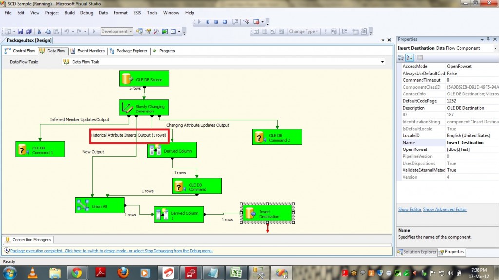 - Once I run the package you can see the package showing “1 rows” under “Historical Attributes Inserts Output” section as shown below.