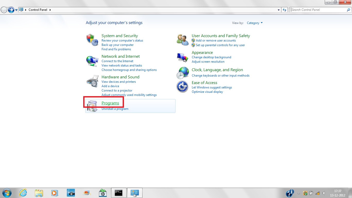 - Select Programs (in windows 7) and Programs and features in earlier versions as shown below.