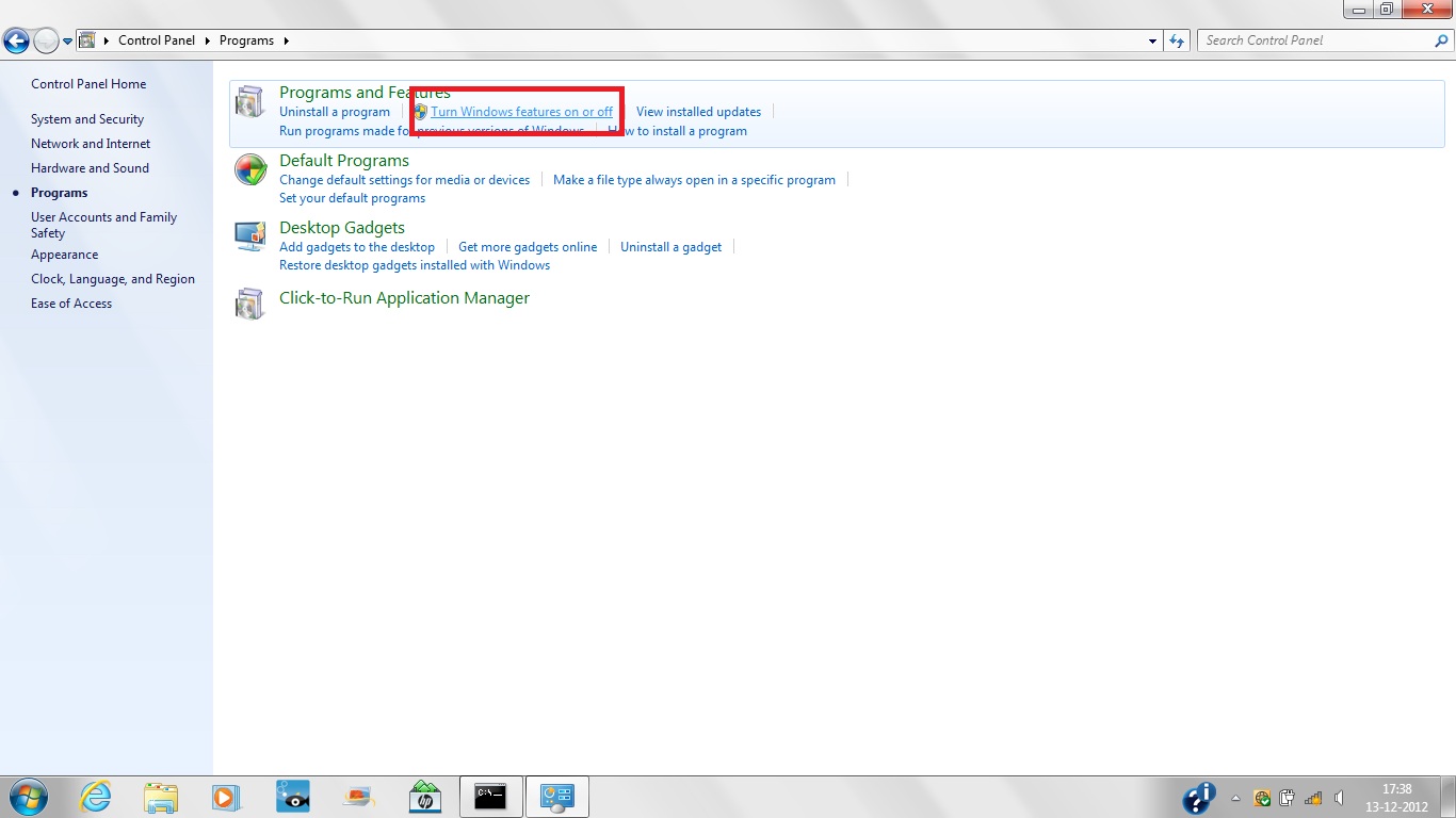 - Select TURN WINDOWS FEATURES ON OR OFF option as shown below.