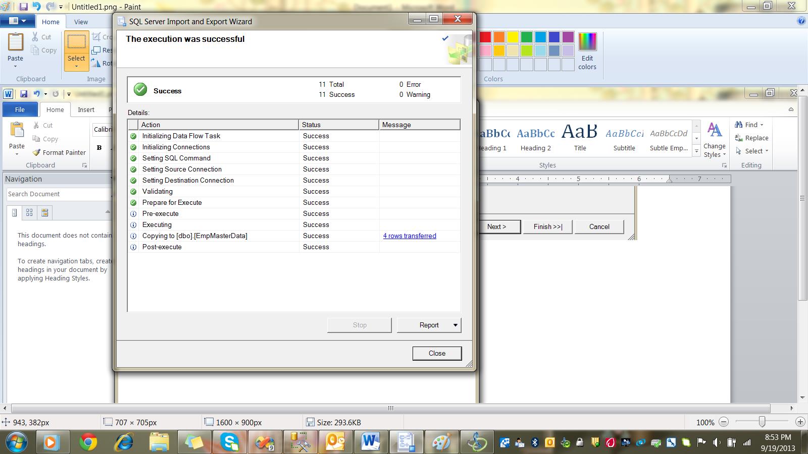 11) Now click Finish and data will be imported as shown below. Please check for all success messages.