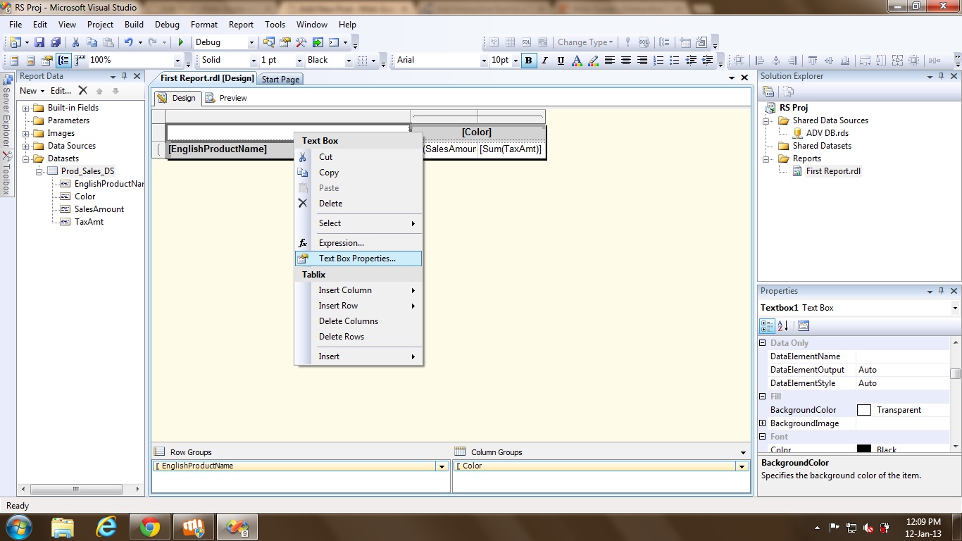Column group is on COLORS column and to implement column grouping right click on the empty cell as shown below and select TextBox Properties option.