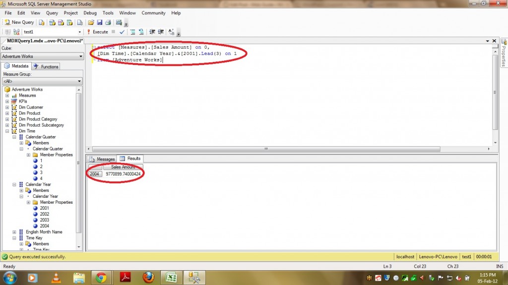 If you see the above query member expression is “[Date].[Fiscal].[Month].[January 2001]” and current member is “January 2001”. We have given LEAD(-5) and hence it will navigate back by FIVE members and will return “August 2000” as output if that member exists in Cube.