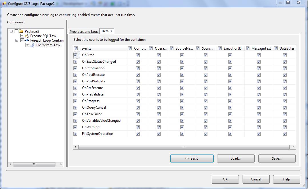 Here you can see Containers on the left hand side which the packages ,task and containers that are available and for that you can create a log. Logs are associated with packages and are configured at the package level. Each task or container in a package can log information to any package log. The tasks and containers in a package can be enabled for logging even if the package itself is not. For example, you can enable logging on an Execute SQL task without enabling logging on the parent package. A package, container, or task can write to multiple logs. You can enable logging on the package only, or you can choose to enable logging on any individual task or container that the package includes.