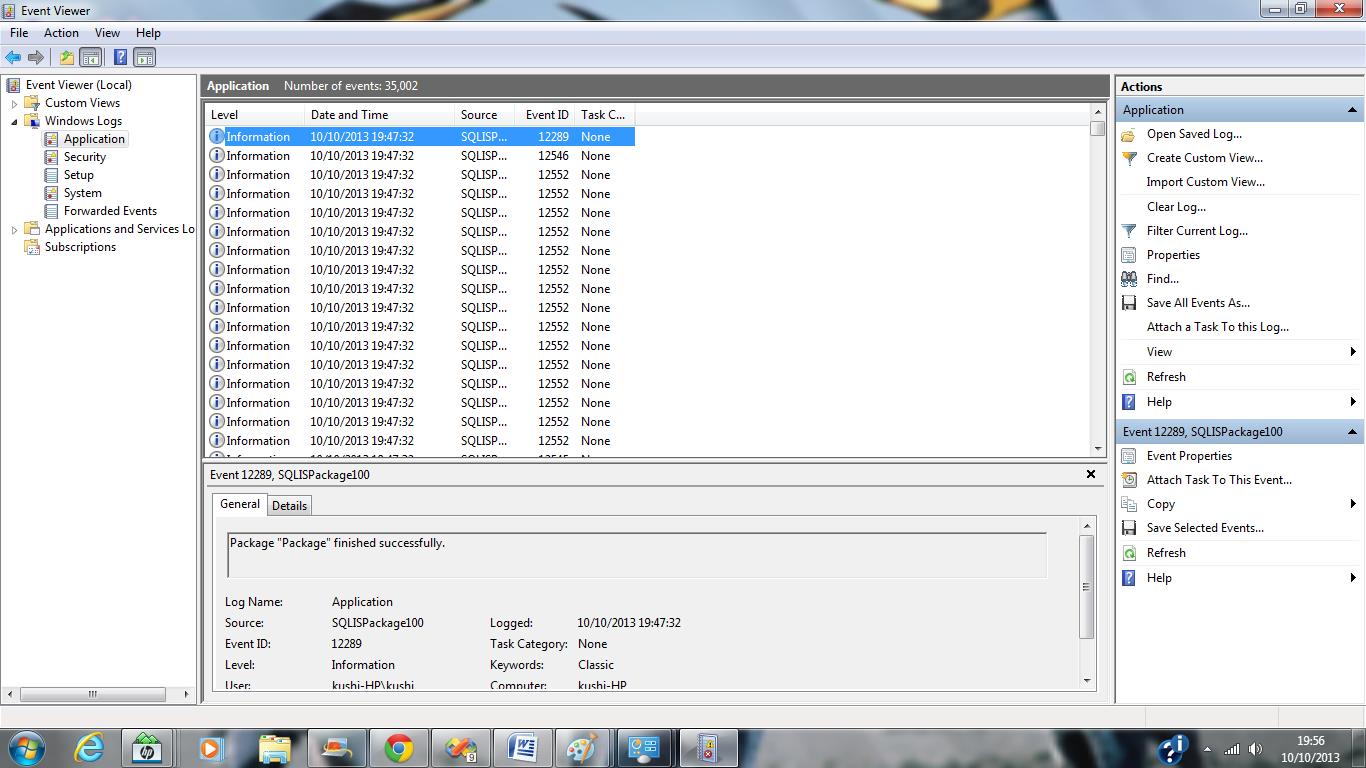 Now Execute the package . After package is executed, go to Control Panel – > Administrative Tools – > Event Viewer – >Windows Logs – > click on Application – > under Source tab with value “SQLISService” are package logged information.