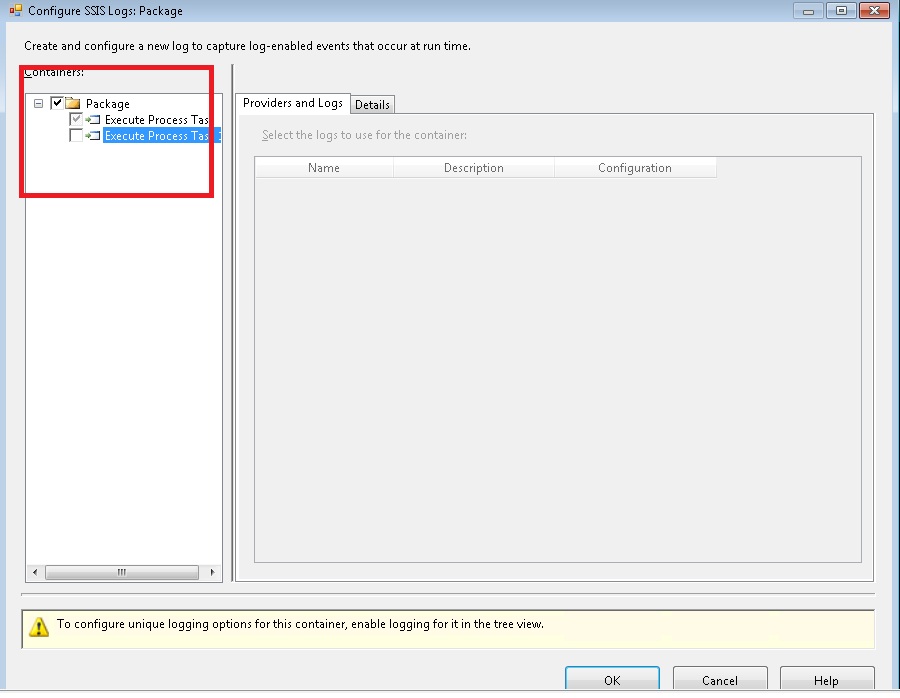 - To enable logging, you must first check the box next to the package name in the left pane. Notice that the checkboxes for the child objects in the package are grayed out. This means that they will inherit the logging properties of the package. You can click into any checkbox to uncheck an object. Clicking again to check the box will allow you to set up logging properties specific for that task or container.