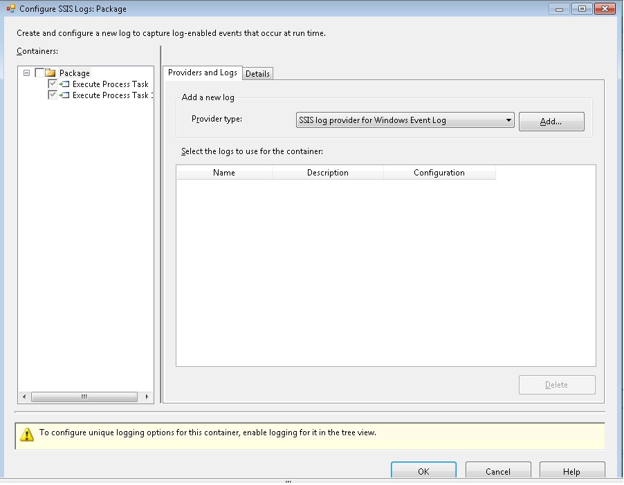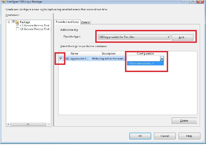 - Next, in the provider drop down, select any provider type of your wish and in this example I will go with “SSIS log provider for TEXT Files” (an easiest one to explain .. :)) and click on ADD.