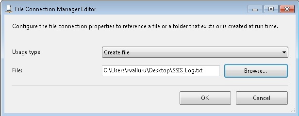 - Click the drop-down under Configuration and choose <New Connection>. Once the File Connection Manager Editor opens, set the Usage Type property to Create File. Type c:\SSIS_Log.txt as the path for the TEXT file or click Browse to the TEXT file location as shown below.