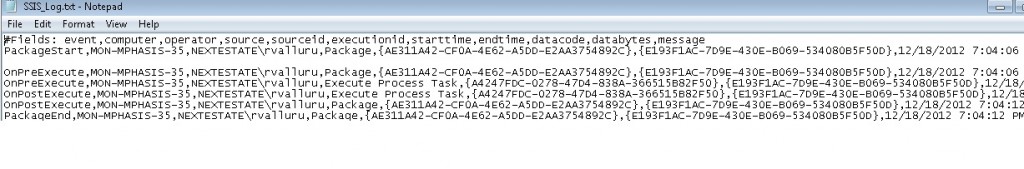 - Click on OK and run the package. Once the package execution has completed, open the log file to view the logs. You can see the logs in the below given format.