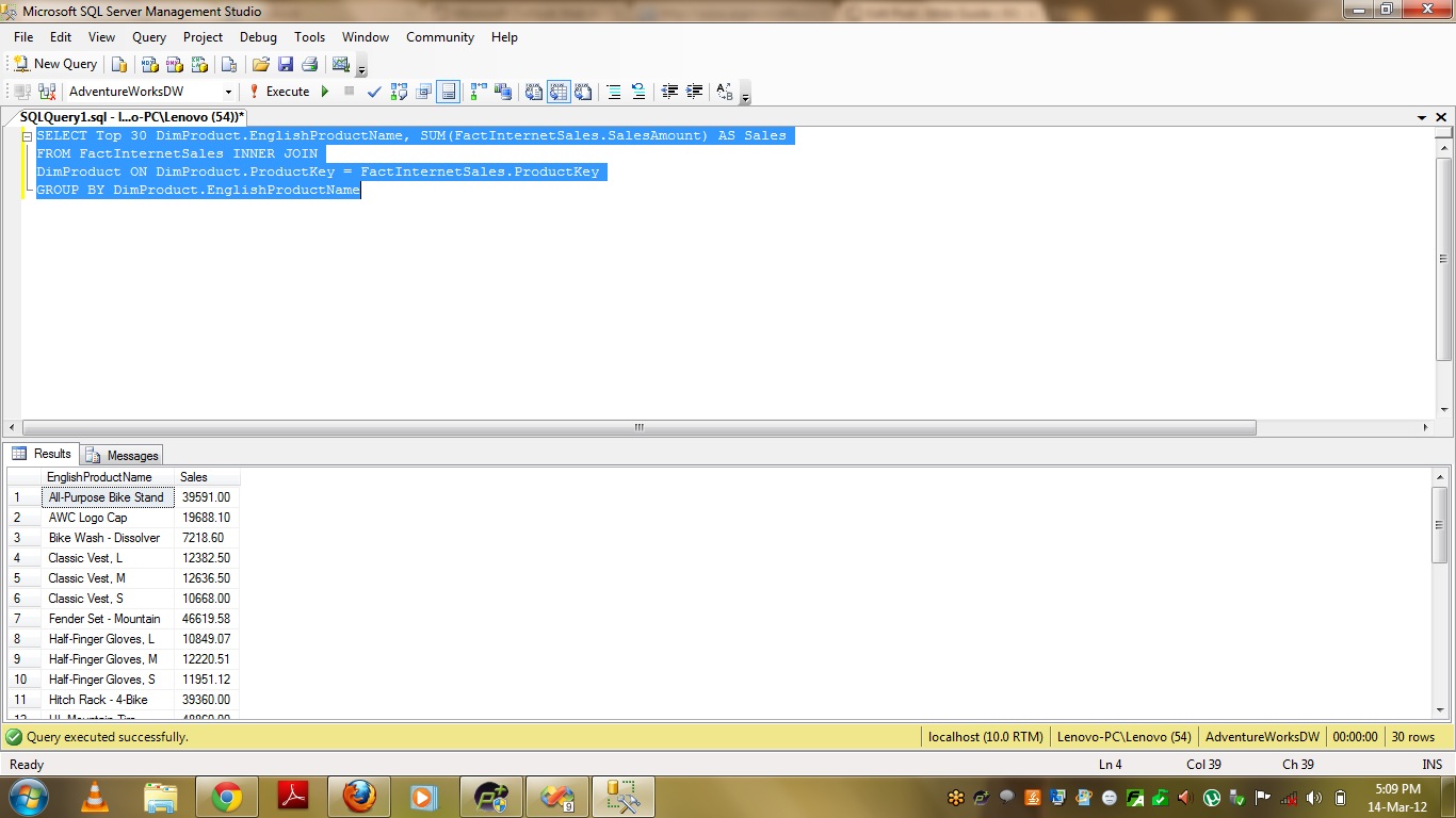 SELECT Top 30 DimProduct.EnglishProductName, SUM(FactInternetSales.SalesAmount) AS Sales