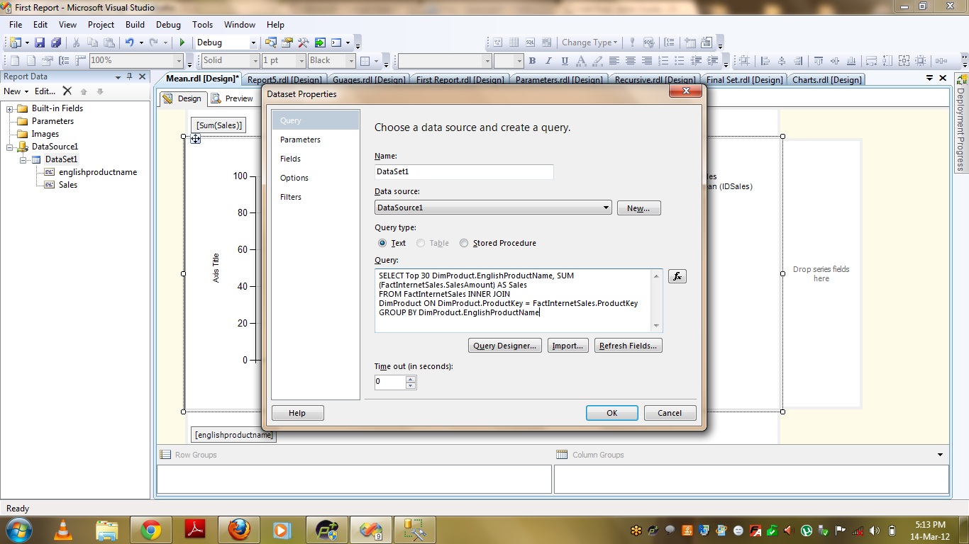 Let us discuss about “How to show MEAN and MEDIAN” of a series in a chart in this post. This post is specially for those who doesn’t know that there is an option available in SSRS to show MEAN and MEDIAN in reports. To demonstrate the same lets us take a simple query from Adventure Works database. This query pulls Product wise sales from the database. PFB the query –