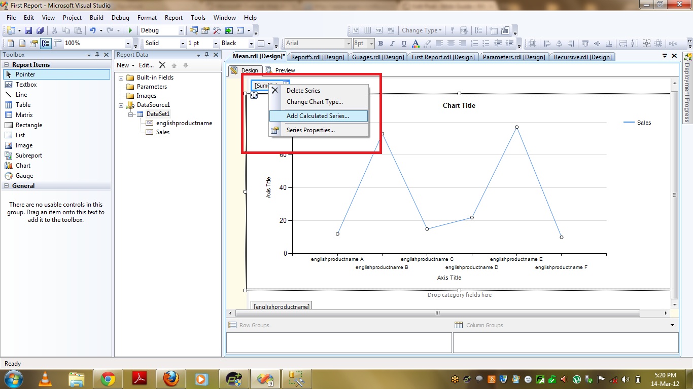 Now take a line chart from ToolBox and drag and drop EnglishProductName to “Category Fields” and Sales to “Data Fields” of Line chart as shown in below pic.