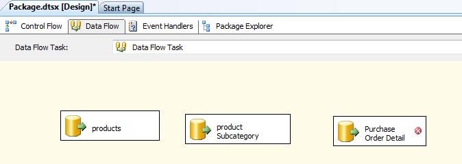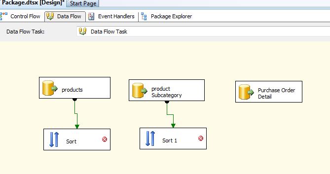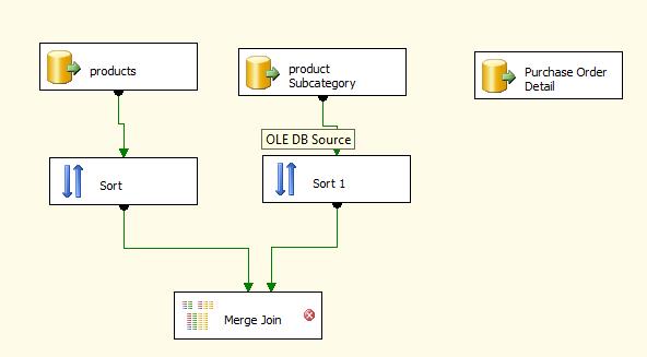 Now we will create two Sort components and join the pipeline from the Merge Join to one of the sorts and join the pipeline from the Purchase Order Detail source to the other sort.