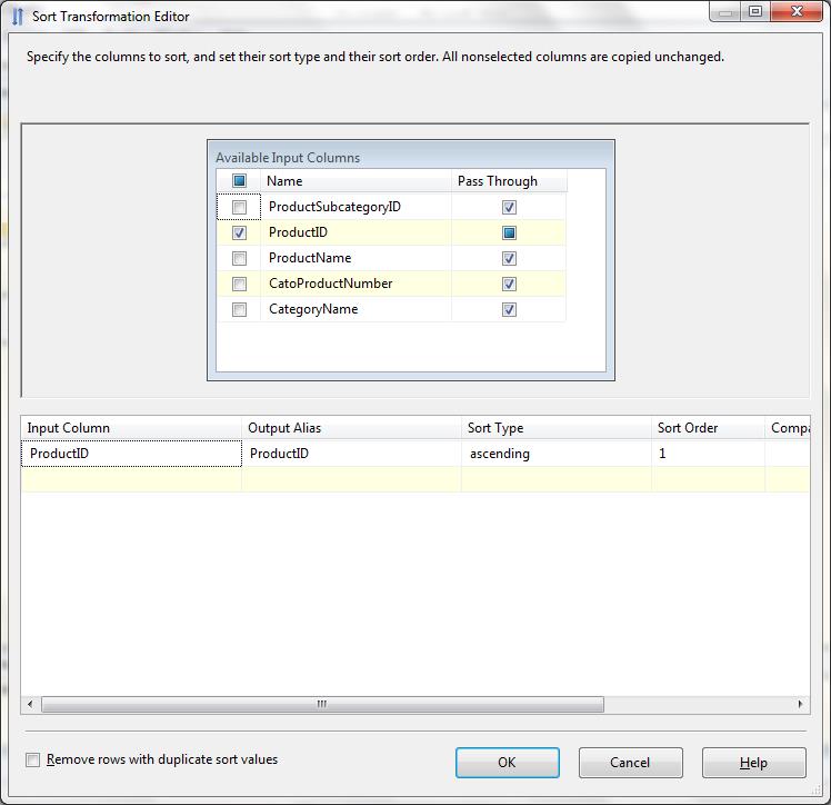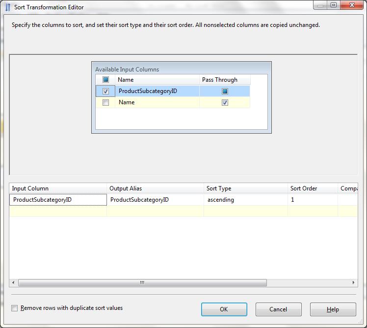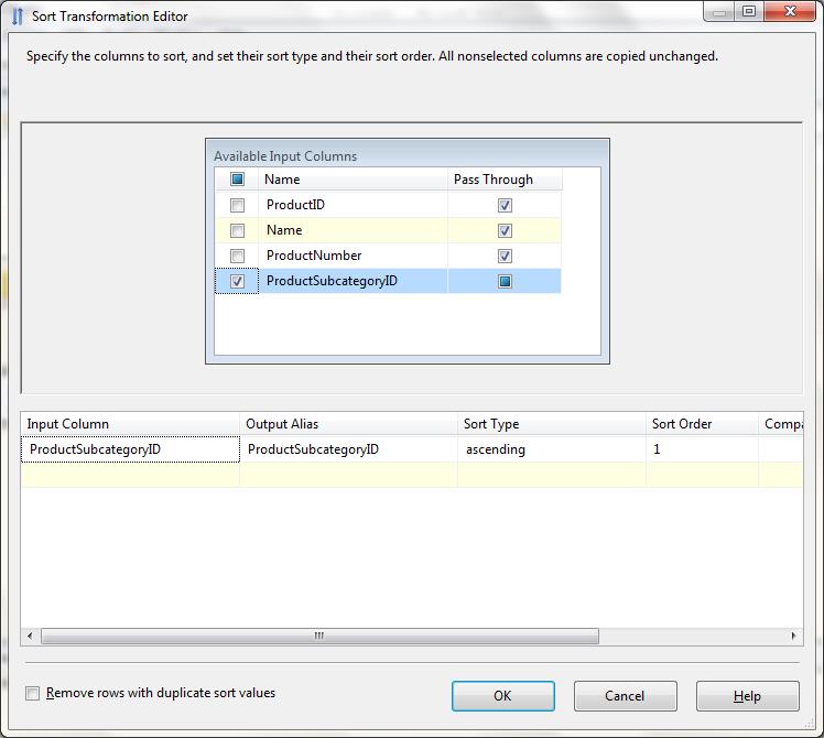 Now Click on the Sort that we connected to the Products source and the Sort Transformation Editor will appear. We want to sort this dataset by ProductSubcategoryID, so click on the checkbox to the left of ProductSubcategoryID. This will put ProductSubcategoryID in the lower box. Now we can click OK when we are complete.