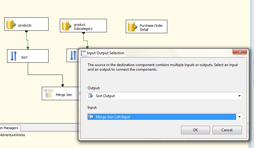 This transformation has two inputs and one output. It does not support an error output. Let’s discuss the same with an example. We will start out with a connection manager that is created for the Adventure works database