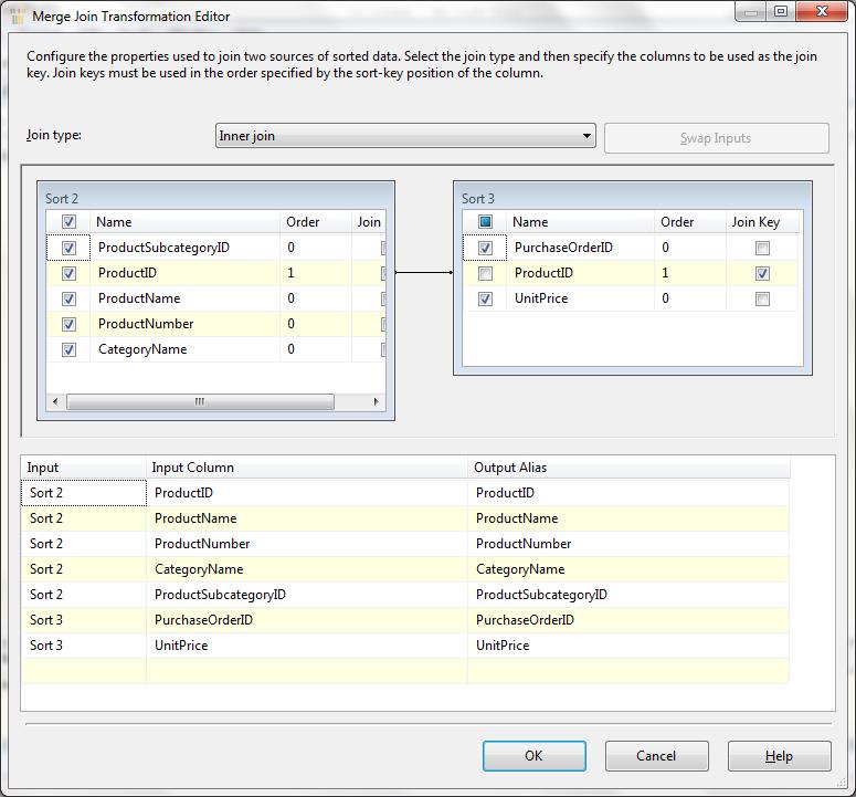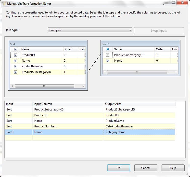Now drag the pipeline arrow from the Product Subcategory Sort to the Merge Join. This time it will most likely not prompt you for which side of the join you want to add this input, as we already selected Left Input for the previous input.