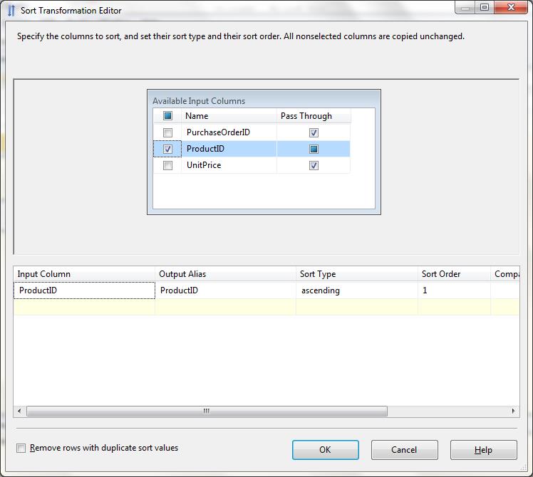 Click on the Sort that we connected to the Purchase Order Detail source and the Sort Transformation Editor will appear. We want to sort this dataset by ProductID, so click on the checkbox to the left of ProductID. This will put ProductID in the lower box. Now we can click OK when we are complete.