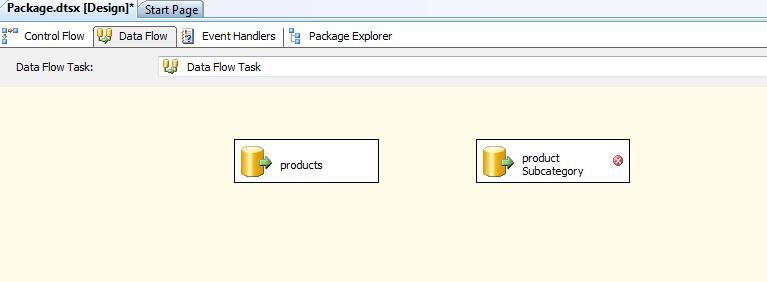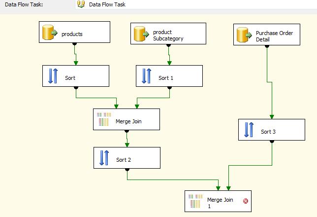 Now add a Merge Join transformation. This will allow us to join the Products and Product Subcategory sources together. Drag the pipeline arrow from the Products Sort to the Merge Join.