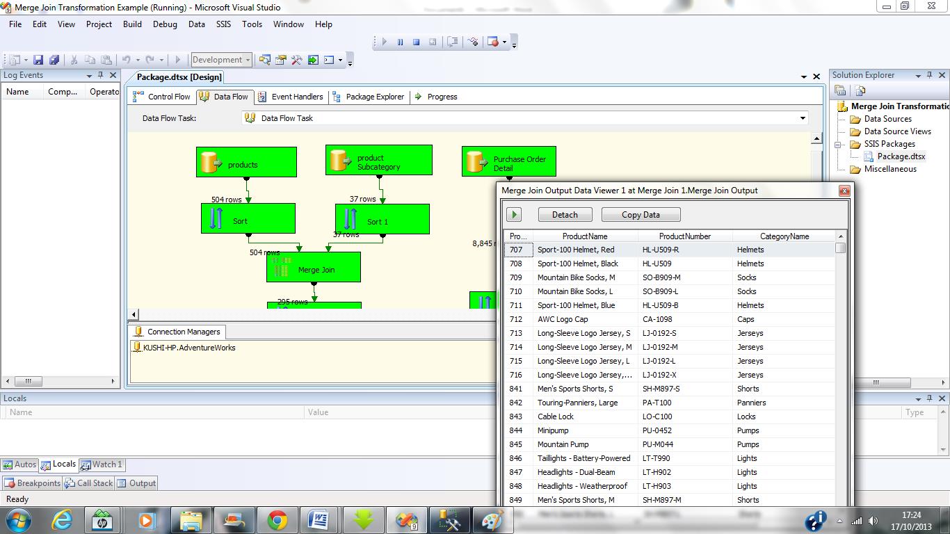 Instead of using OLEDB as destination, I used Audit Transformation for testing purpose and used Data viewer to show output data produced by Merge join Transformation. After testing our package successfully we can delete Audit Transformation and Data Viewer and bring our destination and connect to Merge Join transformation for input columns for our destination.