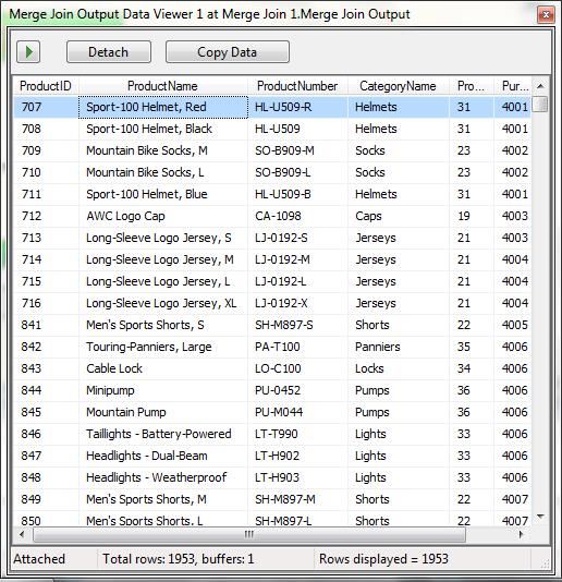 Now we will double click on the Merge Join and the Merge Join Transformation Editor will appear. You will notice that ProductID from both datasets has a line connected to each other. This means that this is the column that we are joining on. You will also notice that the Join Type can be “Inner Join”, “Left Outer Join” or “Full Outer Join”. In order to retain the other columns in the pipeline click on the checkboxes to the left of the column names. If any of the boxes to the left of the columns are not checked, it means that column will no longer be in the pipeline after the Merge Join. Click OK hen completed.