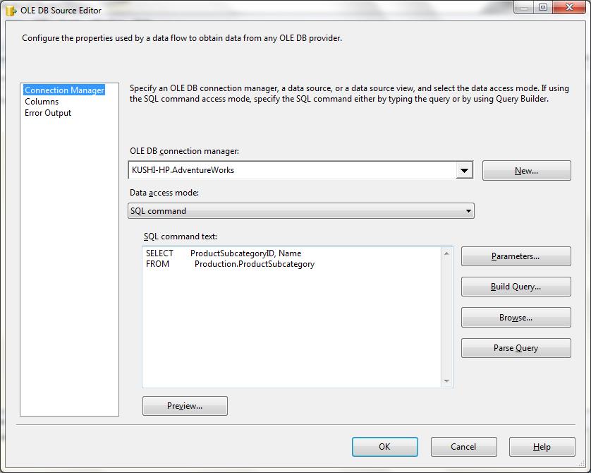Now Double click on the Product Subcategory OLE DB Source and the OLE DB Source Editor will appear. We select SQL Command from the Data Access Mode and will specify the query. This query will select the ProductSubcategoryID, and Name from the ProductCategory table.