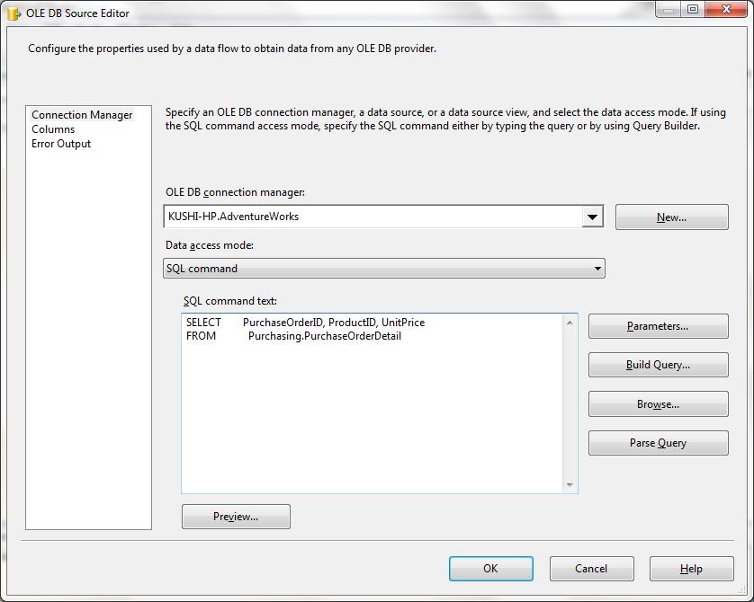 Double click on the Purchase Order Detail OLE DB Source and the OLE DB Source Editor will appear. We select SQL Command from the Data Access Mode and will specify the query. This query will select the PurchaseOrderID, ProductID, and UnitPrice from the PurchaseOrderDetail table.