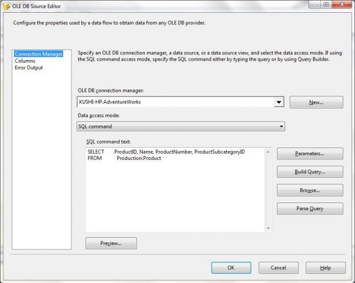 Double click on the Products OLE DB Source and the OLE DB Source Editor will appear. We select SQL Command from the Data Access Mode and will specify the query. This query will select the ProductID, Name, ProductNumber, and ProductSubcategoryID from the Product table.