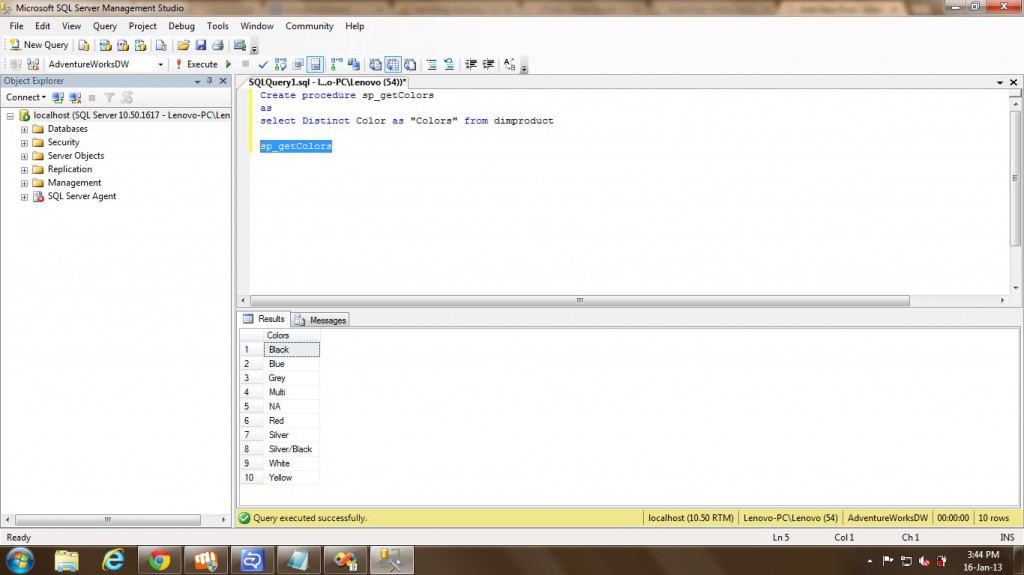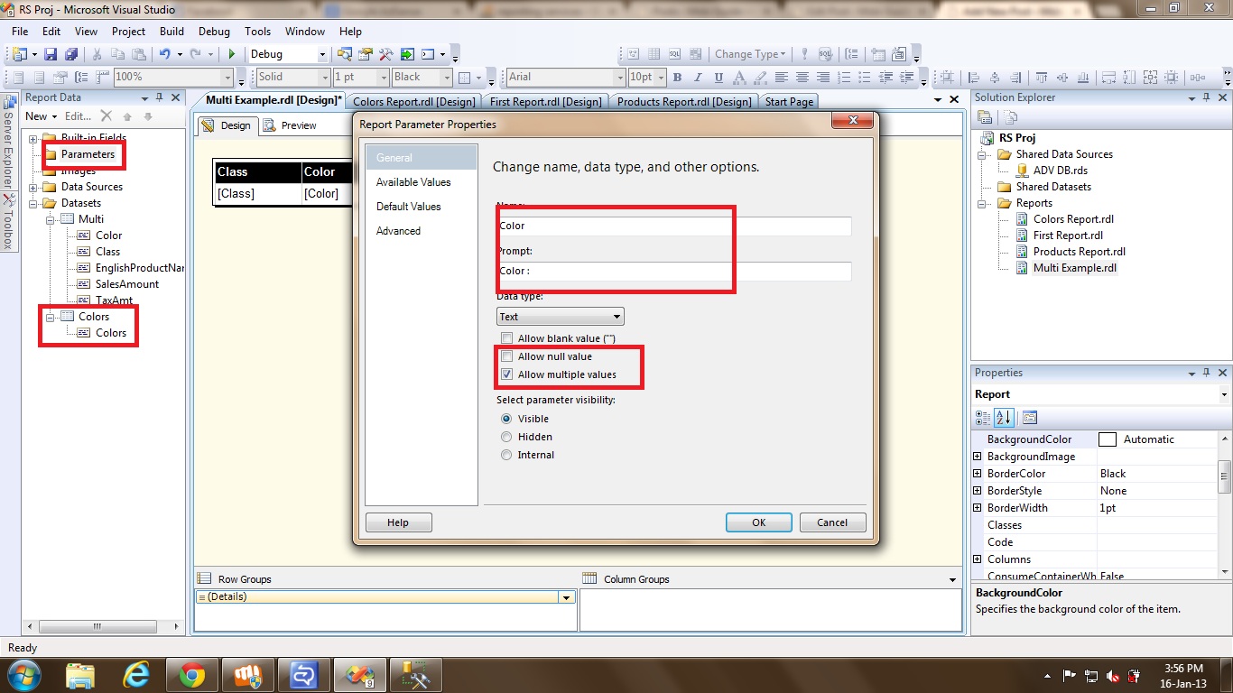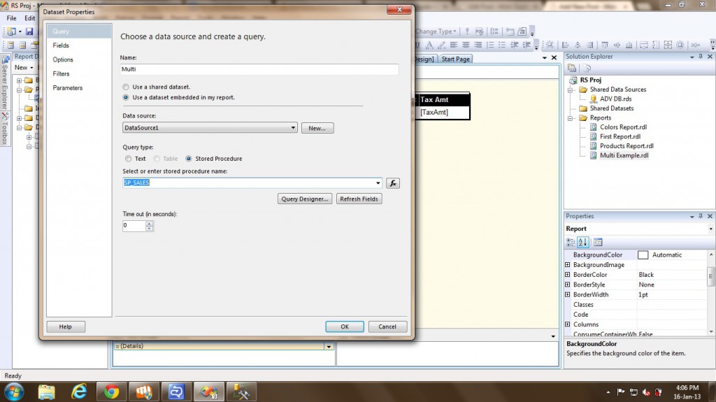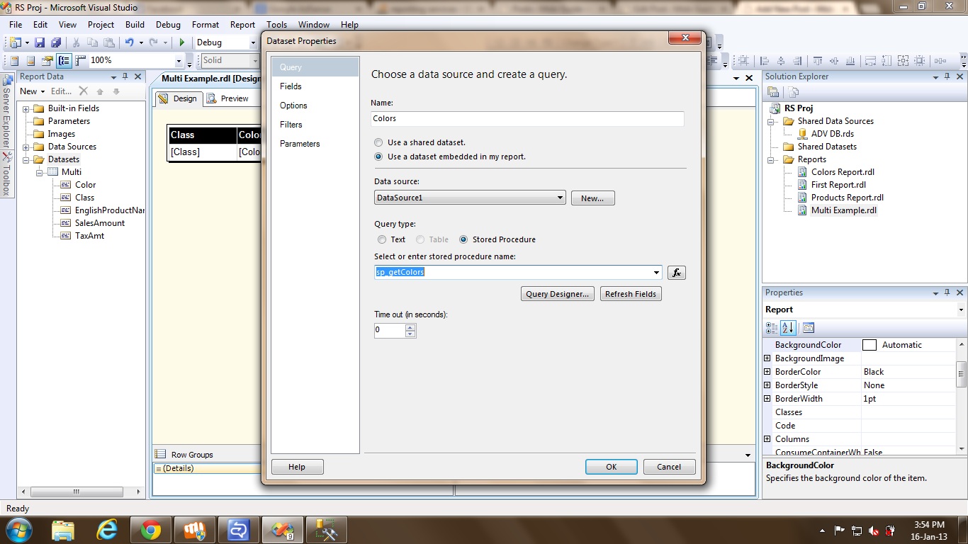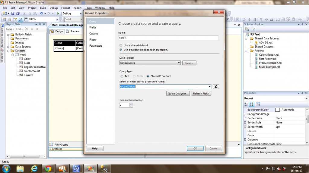 - Select the data source and select the option “Stored Procedure” radio button and provide the Stored Procedure name which pulls values for parameter and as I am adding “Color” as parameter I am using the following stored procedure which pulls Colors data.