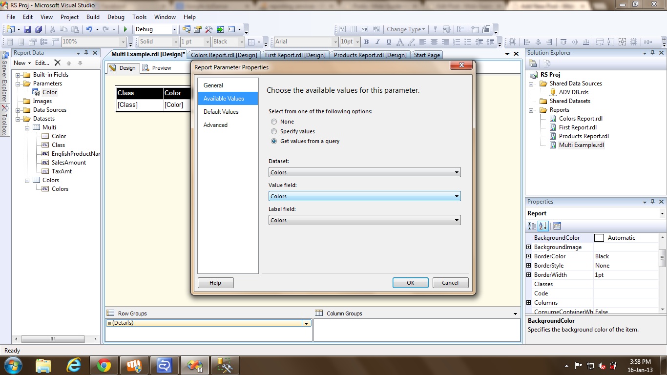 - Now select the “Available Values” tab which is on the Left hand side of the wizard and select the option “Get Values From a Query”. Provide the Dataset name,Value Field and Label Field as shown below –