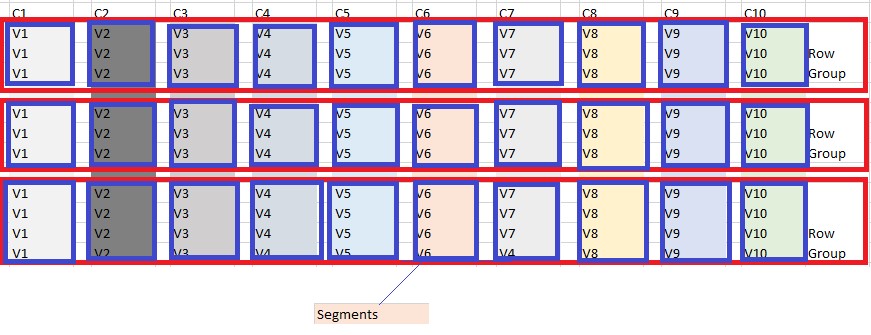 We have grouped the rows of 1 million; call it as Row Group Chunk. In each Row Group which has 10 columns here and each column is stored in its segment. It would be 10 segments. The benefit of storing each column in segment, when I want to rows of columns C1, C2, then I just get segment for column C1, segment for column C2.