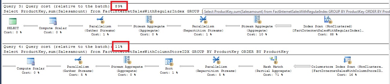 The relative cost of the second query (which uses column store index) is just 11% as opposed to the relative cost of first query (which uses regular index) which is 89%.