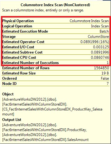 For column store index exclusively, SQL Server 2012 introduces a new execution mode called Batch Mode, which processes batches of rows (as opposed to the row by row processing in case of regular index) that is optimized for multicore CPUs and increased memory throughput of modern hardware architecture. It also introduced a new operator for column store index processing as shown below: