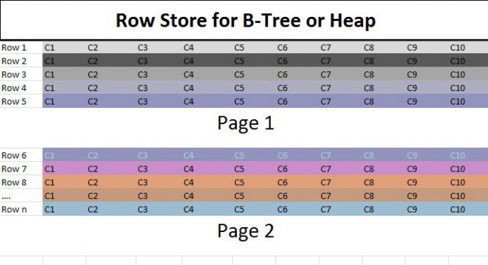In any traditional relational DBMS, the data is stored as rows (B-Tree format). Like, Microsoft SQL Server stores rows in a page of size of 8 K. If you have a row of 10 columns, you store Row 1 , Row 2 and when page becomes full the page 8 K, then Row goes to second page and so on. This is how the data is stored, successfully formats and successfully for OLTP Workloads. For example consider the image below the data for ten columns for each row gets stored together contiguously on the same page and once the data is full and the row goes to second page.